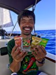 Our favorite time on the boat is meal time. But, to be always on the safe side, we should avoid cutting, or cooking on the stove on the rocking boat. Even if we really want to cook, most of the ingredients go bad after a month. In that circumstances, freeze-dried foods are the best. I knew Amano’s freeze-dried foods had good quality. Every time I travelled to Japan for a visit, I always bought brought them back to the States. Green onion, Shijimi (shellfish) miso soups are really good. When I checked their online store to prepare for this voyage, I got to know more variety of items, like nyumen (noodles), donburi, pastas… I ordered them and all the items tasted pretty good, so we decided to choose these for our main foods for the voyage. Amano feeds me for breakfast, lunch, dinner and mid-night snack. You should try some too! OK, what’s for lunch?