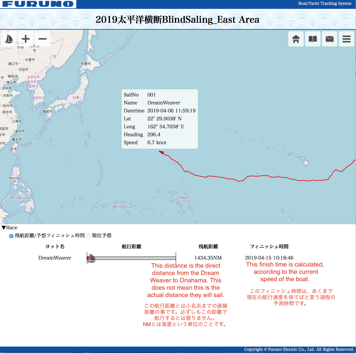 古野電気様からトラッキングシステムをご提供頂きました。西宮より技術者の森様を派遣くださり、設置しました。上記のリンクよりドリームウィーバーの位置がご確認頂けます。サイトを開いていただき、右上のメニューより「アニメーション」と「航跡」をオンにしていただきますと再生のバーが表示されます。その再生ボタンをクリックして航跡をご覧いただけます。上手くいかない場合はブラウザをChromeでお試しください。MacではSafariも使えます。